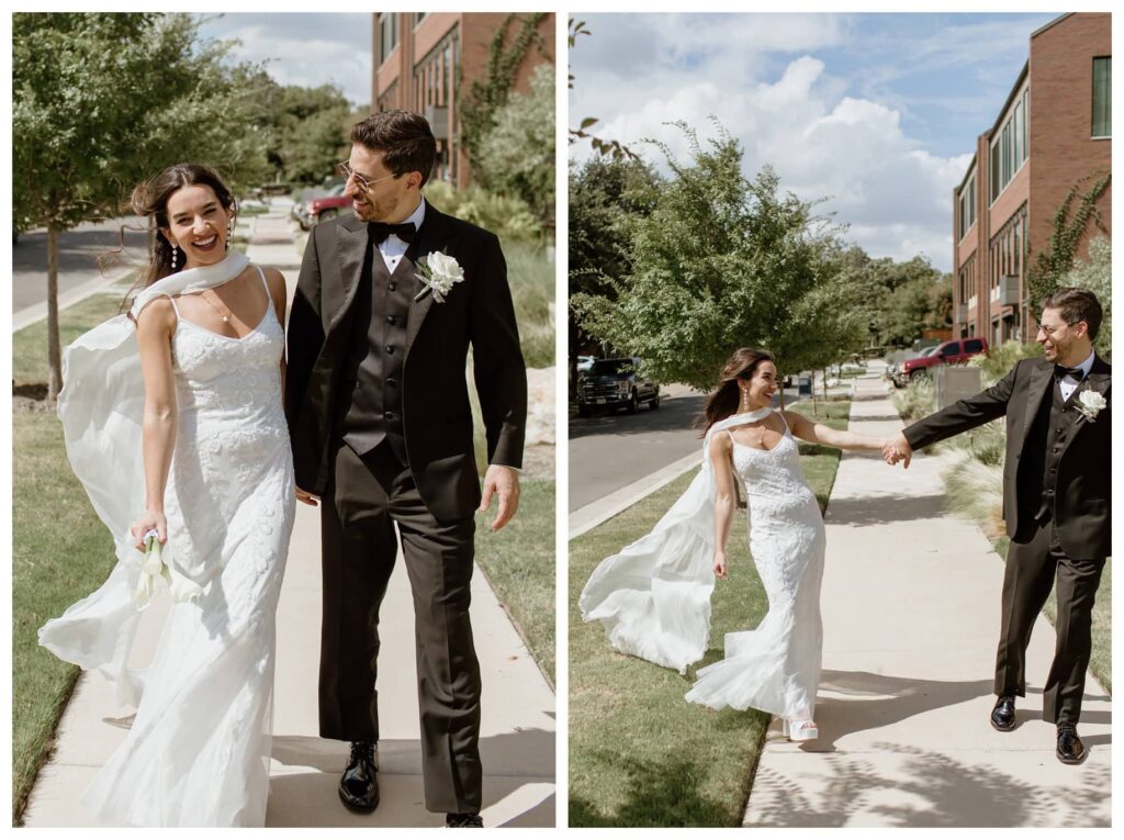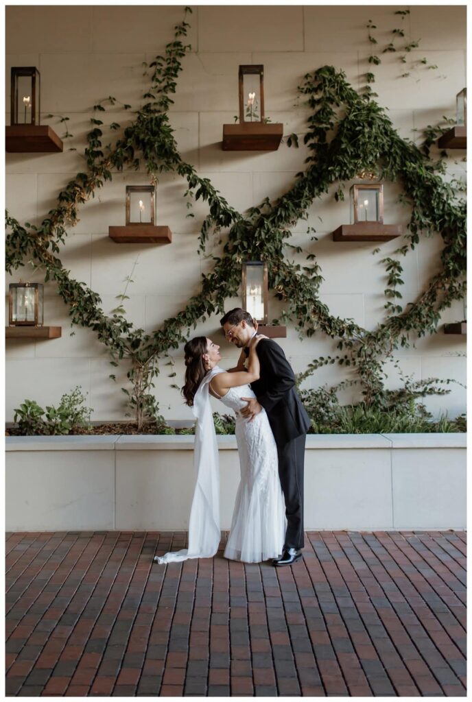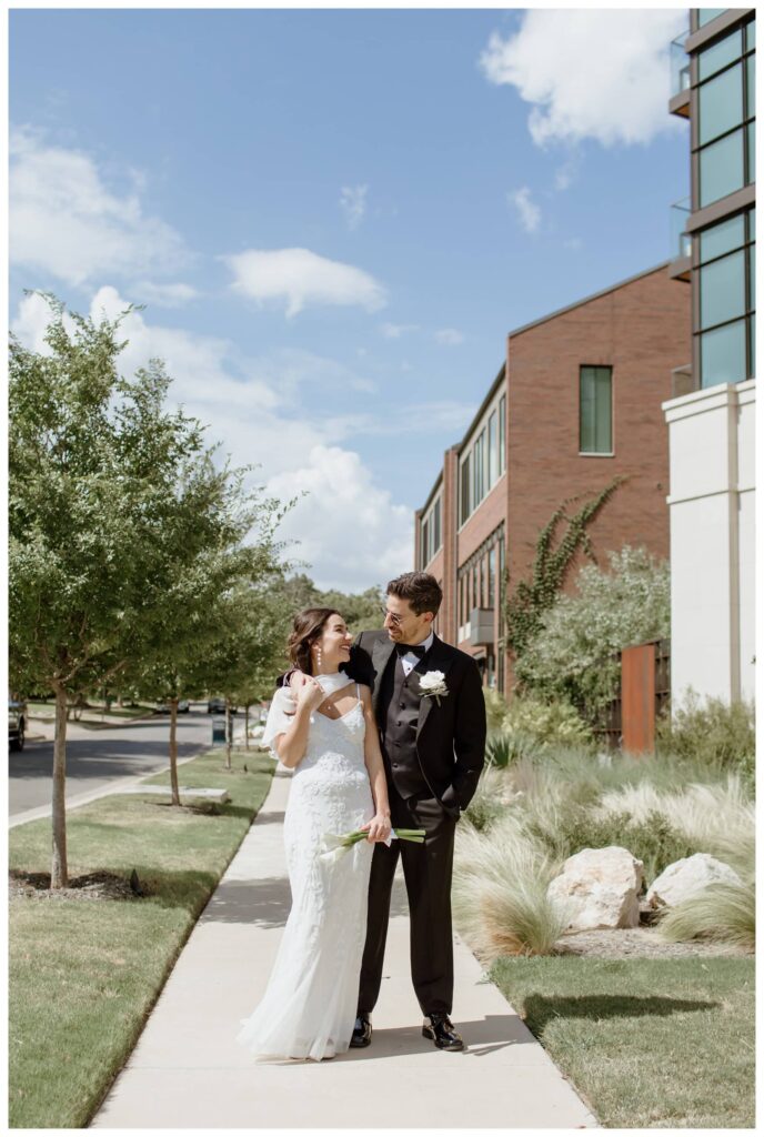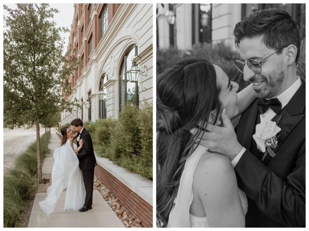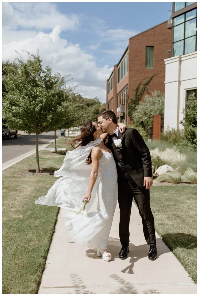 We started with a private first look in their hotel room, where floor-to-ceiling windows looked out over the Fort Worth skyline (and the lovely CVS parking lot). We then moved to the Billet Room, a colorful and classy little game room with gorgeous natural light – perfect for indoor wedding photos in Fort Worth, especially during the August heat. But Antonella and Kevin are total troopers, and they happily stepped outside as well, where we had more room for playful moments along the historic bricks of Camp Bowie Blvd.